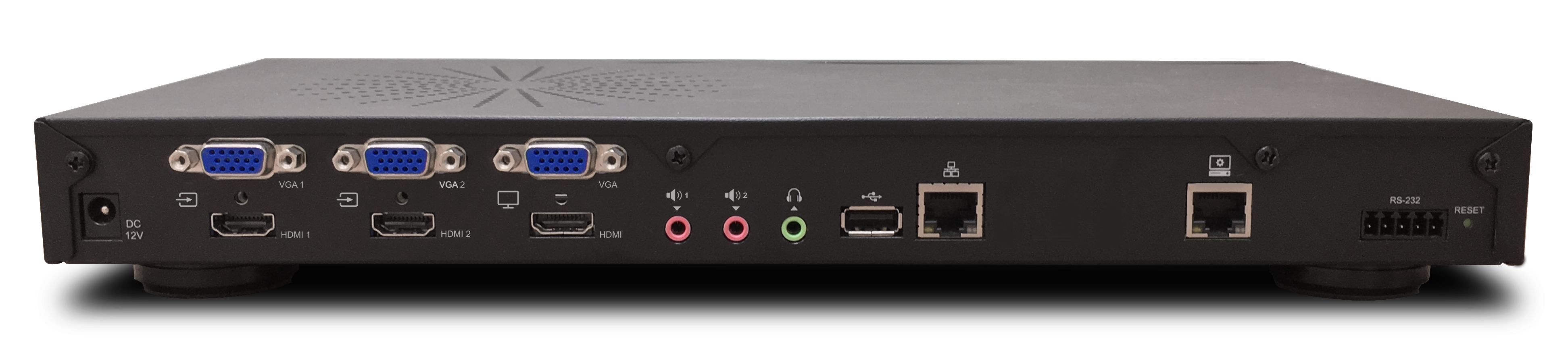 Salidas HDMI y VGA con opción de GUI en pantalla, y salida de línea estéreo de audio (3,5 mm)